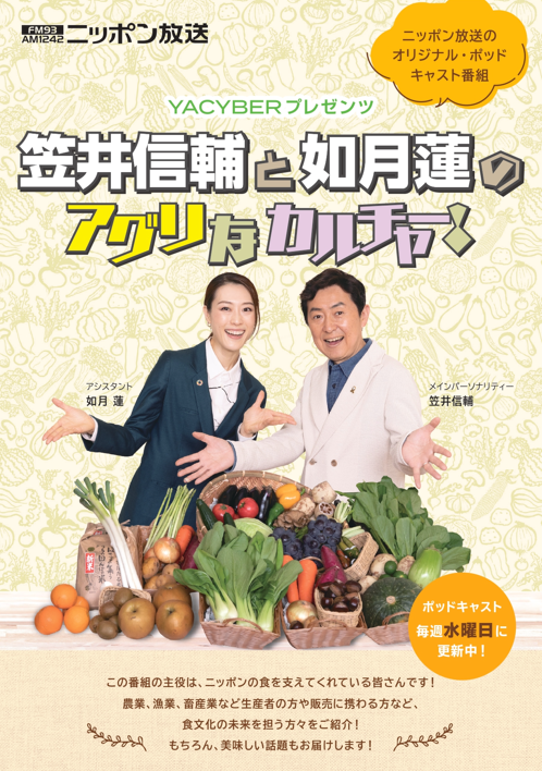 2021年10月からスタートしたニッポン放送のポッドキャスト番組。全国の農業生産者を中心に、ニッポンの食の担い手たちを毎回ゲストに迎え、番組パーソナリティの笠井信輔とアシスタントの如月 蓮が心通わせるトークバラエティです!ゲストの農業・食への熱い想いを、笠井・如月がやさしく受けとめ、「アグリなカルチャー談義」に仕上げていきます。笠井・如月のハイテンションな掛け合いトークもお楽しみに!