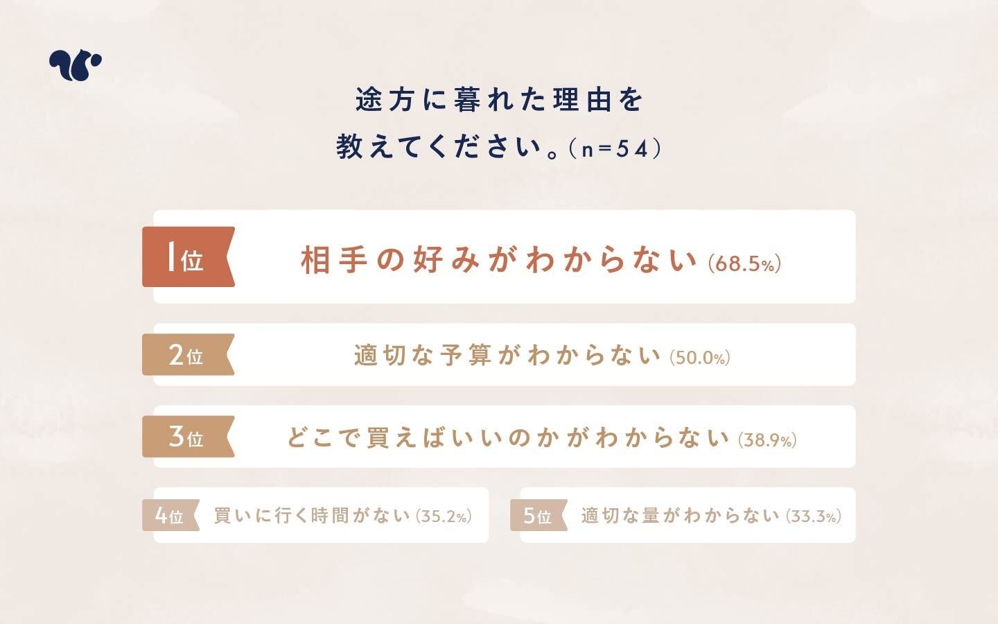 理由としては、「相手の好みがわからない(68.5%)」「適切な予算がわからない(50.0%)」「どこで買えばいいのかがわからない(38.9%)」などがあげられた。