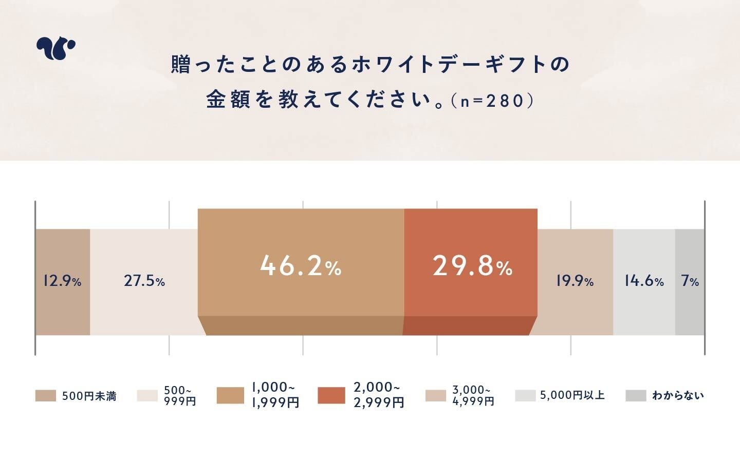 - 贈ったことのあるホワイトデーギフトの金額で多かったのは「1,000円〜1,999円(46.2%)」、次いで「2,000円〜2,999円(29.8%)」