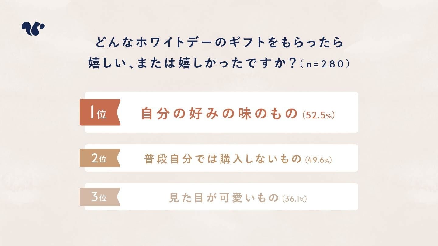 - ホワイトデーのギフトには「自分の好みの味のもの(52.5%)」をもらったら嬉しいという人が半数を占めた