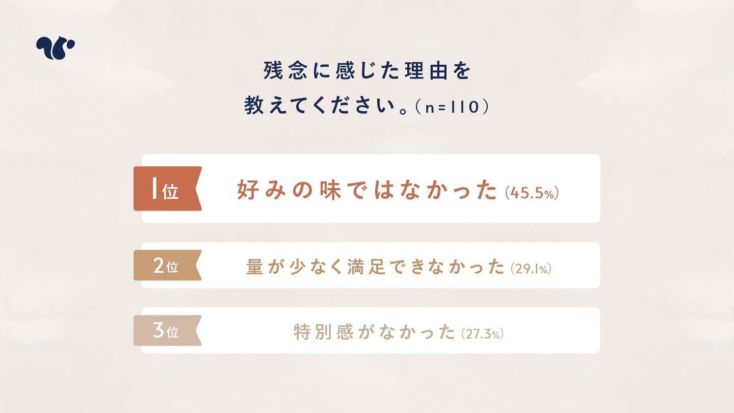 その理由としては、「味が好みではなかった(45.5%)」「量が少なく満足できなかった(29.1%)」「特別感がなかった(27.3%)」の順で多く回答が集まりました。