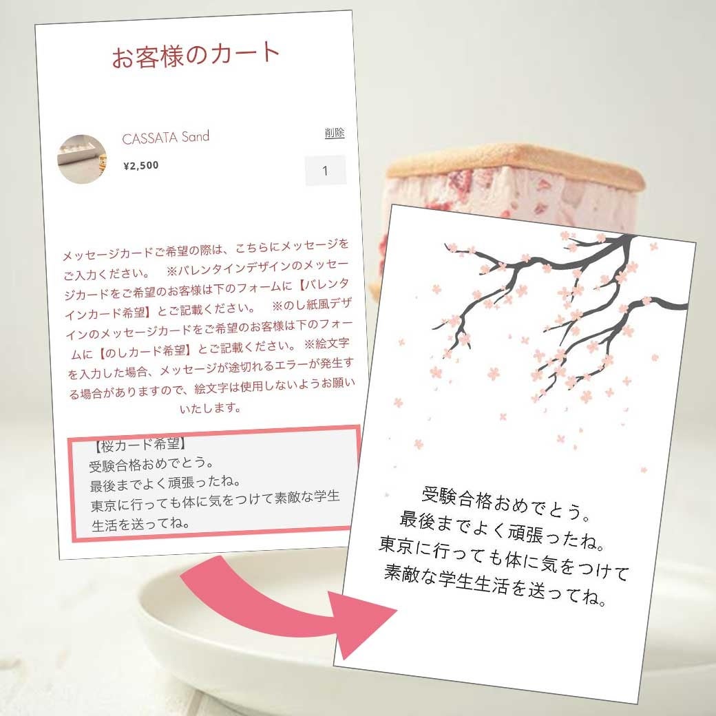 桜デザインのメッセージカードをご希望の方は、メッセージ入力の際に以上のイメージ画像のようにご記載ください。
