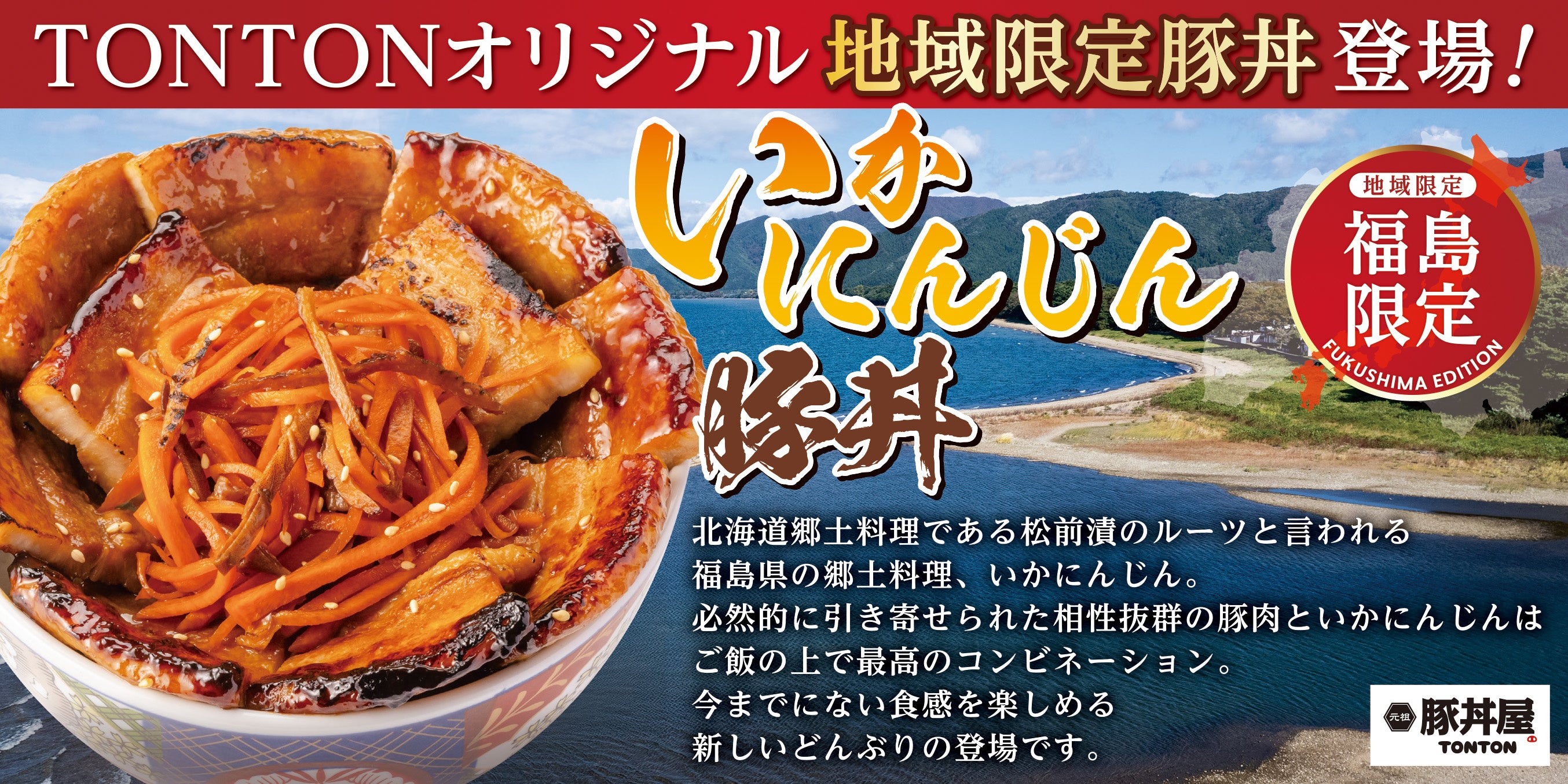 ワンズトライン株式会社(本社:大阪市北区芝田2丁目3番16号、代表取締役:山内仁)が運営する、ボリュームたっぷりの北海道・帯広豚丼が人気の「元祖豚丼屋TONTON」で、地域限定豚丼が登場します。福島県、郡山店/郡山日出山店では“福島限定”となる「いかにんじん豚丼」の販売を開始いたします。