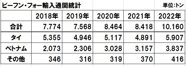 通関統計によると、2022年1月~12月のビーフンに代表されるコメを主原料にしためんの輸入量※1は、10,159tとなり、2021年の8,418tと比較し120.7%と伸長し、過去最高※2となりました。内訳をみると、1位のタイが5,907t(前年4,891t/対前年比120.8%)、2位のベトナムが3,837t(同3,157t/同121.5%)となりました。