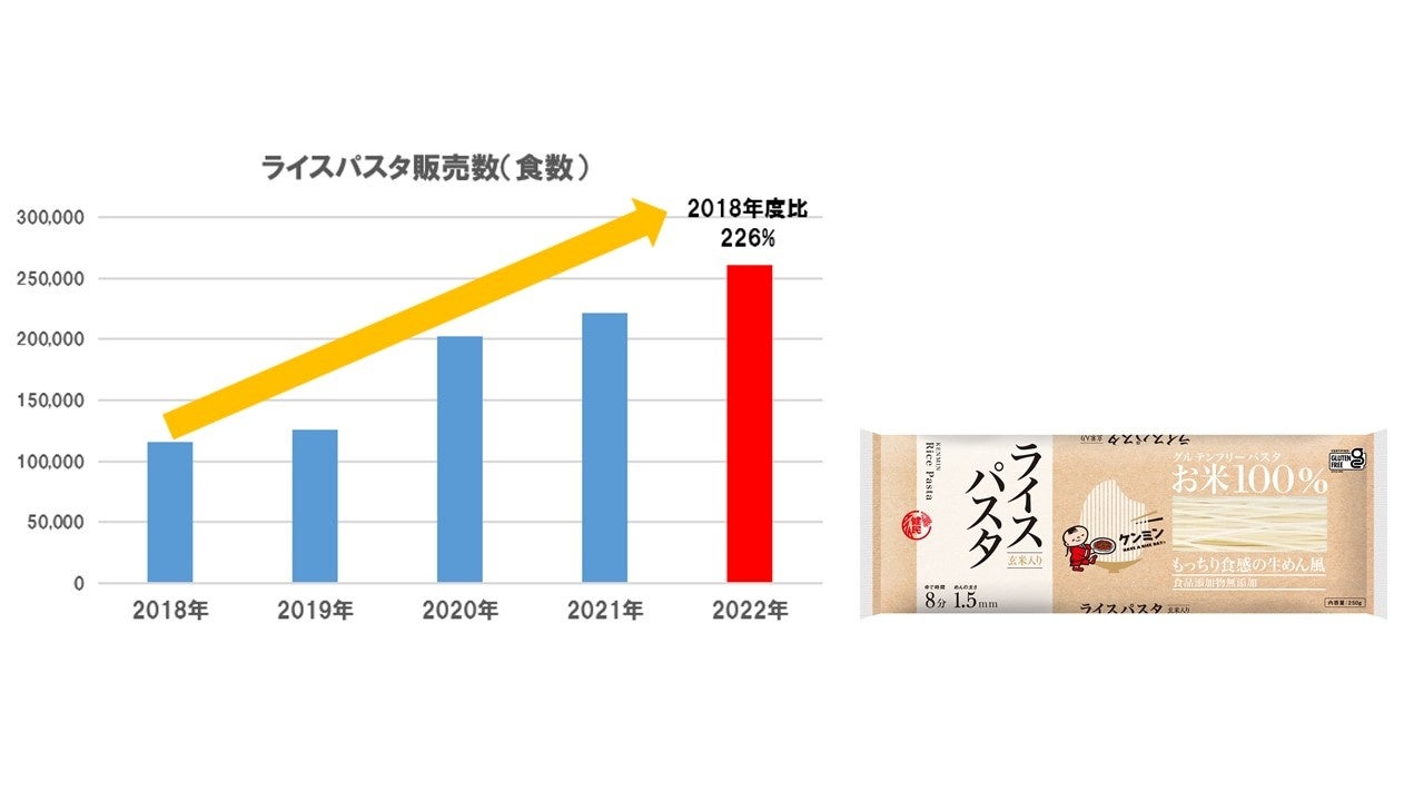 また小麦高騰の影響やコロナ禍を機とする健康意識の高まりからグルテンフリーへの関心が高まり、「ライスパスタ」が111%、過去5年間で226%伸長し、過去最高売上となりました。