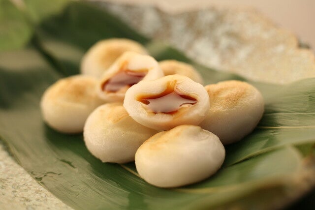 浪芳庵を代表する味。利尻産の昆布だしと湯浅のたまり醤油を煮詰めた特製だれを、やわらかいお餅の中に閉じ込めました。食べるとお餅の中からたれがとろりと広がります。モチモチ、トロトロの食感をお楽しみください。