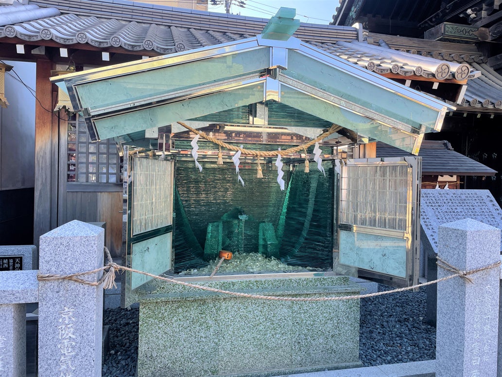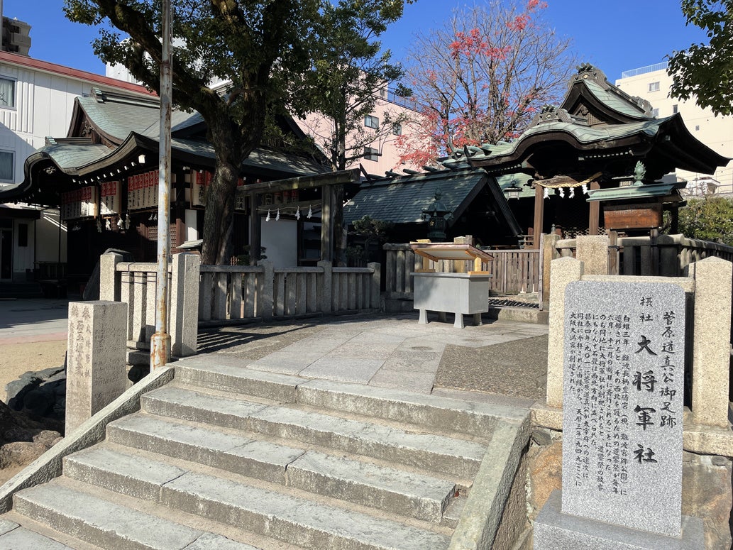 大阪天満宮の境内西北に「大将軍社(写真)」という社があり、道真公が大宰府へ向かう前に旅の無事を祈願しました。大宰府で道真公が亡くなった約50年後、この場所で一夜にして生えた七本の松が梢を光らせたといいます。それを聞いた第62代天皇・村上天皇が大将軍社に社を建て、道真公の御霊を祀ったことが大阪天満宮の起源です。