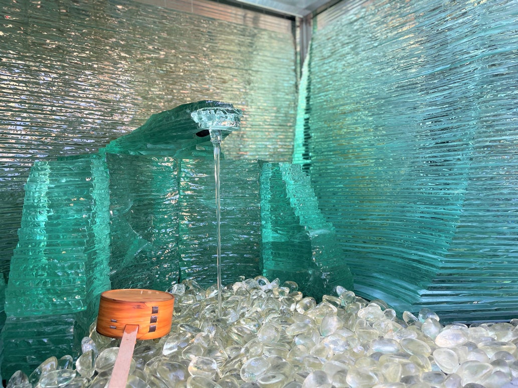 水が流れ落ちきらきらと輝くガラスの水舎は、神秘的な雰囲気でフォトジェニック。