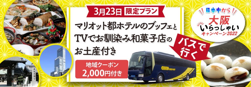 株式会社フォーティーズ(本社:大阪市鶴見区、代表取締役 岡武史)は大阪府の全国旅行支援「“日本中から”大阪いらっしゃいキャンペーン」対象商品大阪出発《全国旅行支援》3月23日(木)限定プラン 大阪マリオット都ホテルのランチブッフェ&TVでお馴染み和菓子店のお土産付き バスで行く『大阪、二大、人気店巡り』日帰りバスツアーのオンライン販売を開始しました。