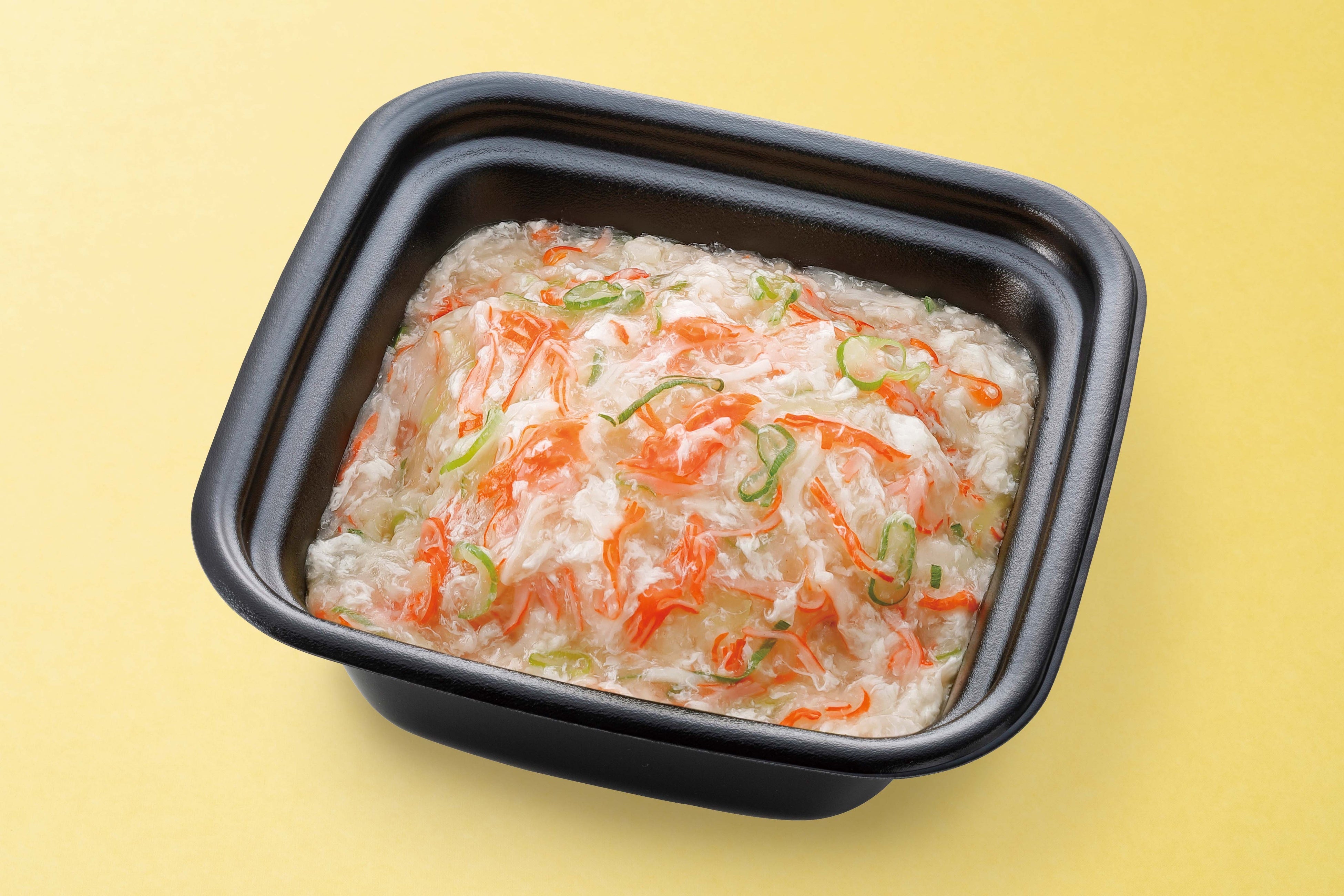 カニカマと卵白と長ネギで仕上げた『塩あんかけ』を、チャーハンにたっぷりかけました。カニカマの赤色と卵白の白色が春を感じる華やかさ。やさしい味わいの塩あんです。