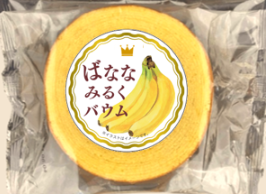 商品特徴:バナナピューレを使用し、しっとりとした食感が楽しめるバウムクーヘンです。