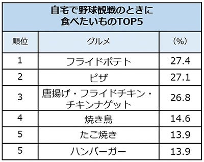自宅のTVで野球観戦をするときに食べたいものについて、ホットペッパーグルメ外食総研がピックアップした20品目から選んでもらったところ、1位「フライドポテト」(27.4%)、2位「ピザ」(27.1%)、3位「唐揚げ・フライドチキン・チキンナゲット」(26.8%)の順でした。