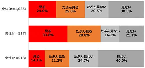 この3月に開幕する野球の世界一決定戦について調査したところ、「見る」「たぶん見る」を合わせた割合は全体で49.0%と約半数でした。また、「見る」「たぶん見る」の合計について男女別に見てみると、男性は62.6%、女性は35.3%と約1.8倍の差があることが分かりました。