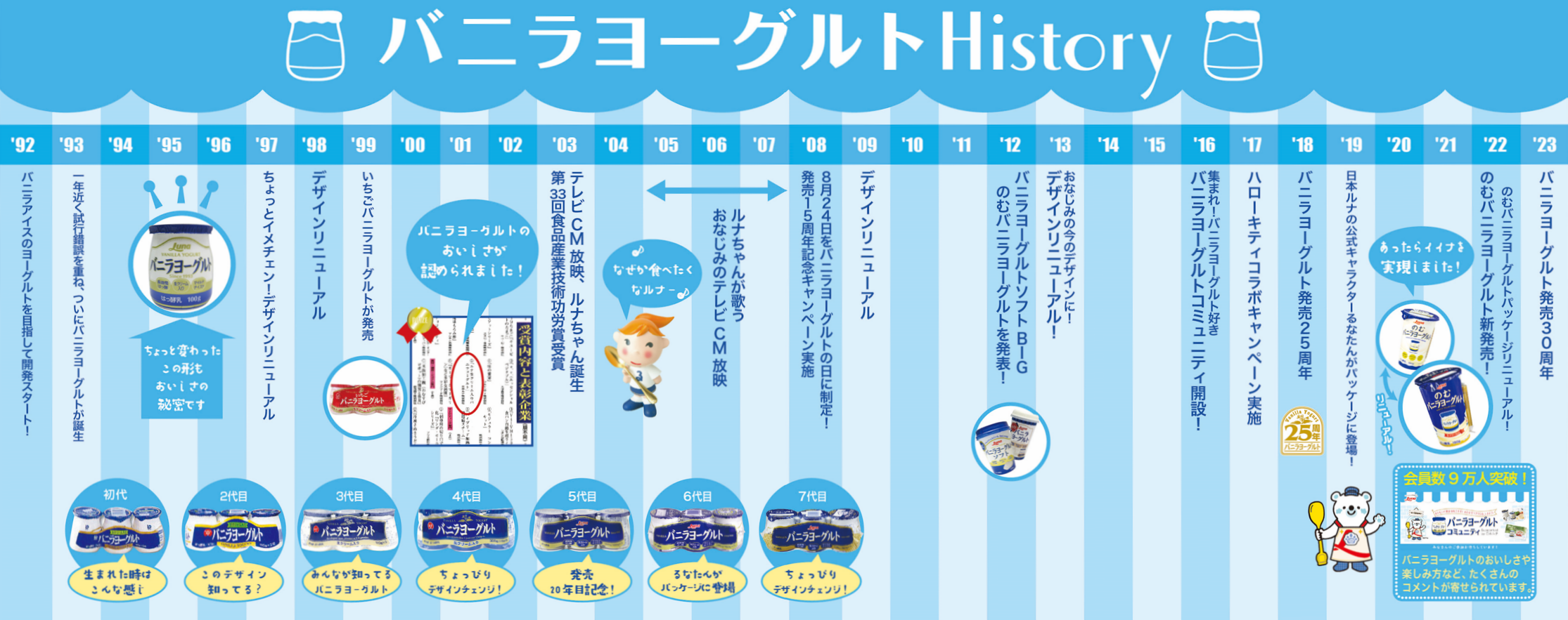 1993年に発売した『バニラヨーグルト』は、2023年度で発売30周年を迎えます。ヨーグルトといえば酸っぱいものというイメージがあった当時、バニラアイスのようなデザートヨーグルトを目指して生まれ、これまで幅広い年代の方にお召し上がりいただいています。定番の『バニラヨーグルト』だけではなく、『福岡あまおう苺』や『白ぶどう シャルドネ』など、バニラヨーグルトのクリーミーなおいしさをお楽しみいただけるフレーバー商品も展開しています。
