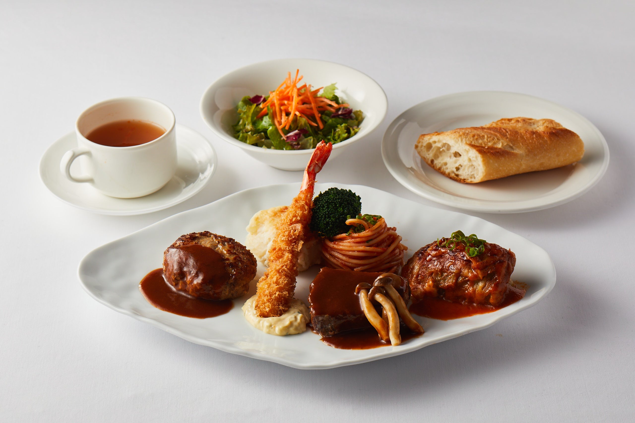 人気の洋食店として有名な<グリル満天星 麻布十番>からは定番のワンプレートミックスをブラッシュアップしたメニュー。元々はハンバーグや海老フライなどから2種類の選べるワンプレートミックスですが、こちらの大人さまランチは、ワンプレートでハンバーグ、海老フライ、ロールキャベツ、ビーフシチューという4種類が楽しめます。この企画のために作ったトマトスパゲティやミネストローネスープなど、まさにお子さまランチからの進化版「大人さまランチ」が誕生しました。