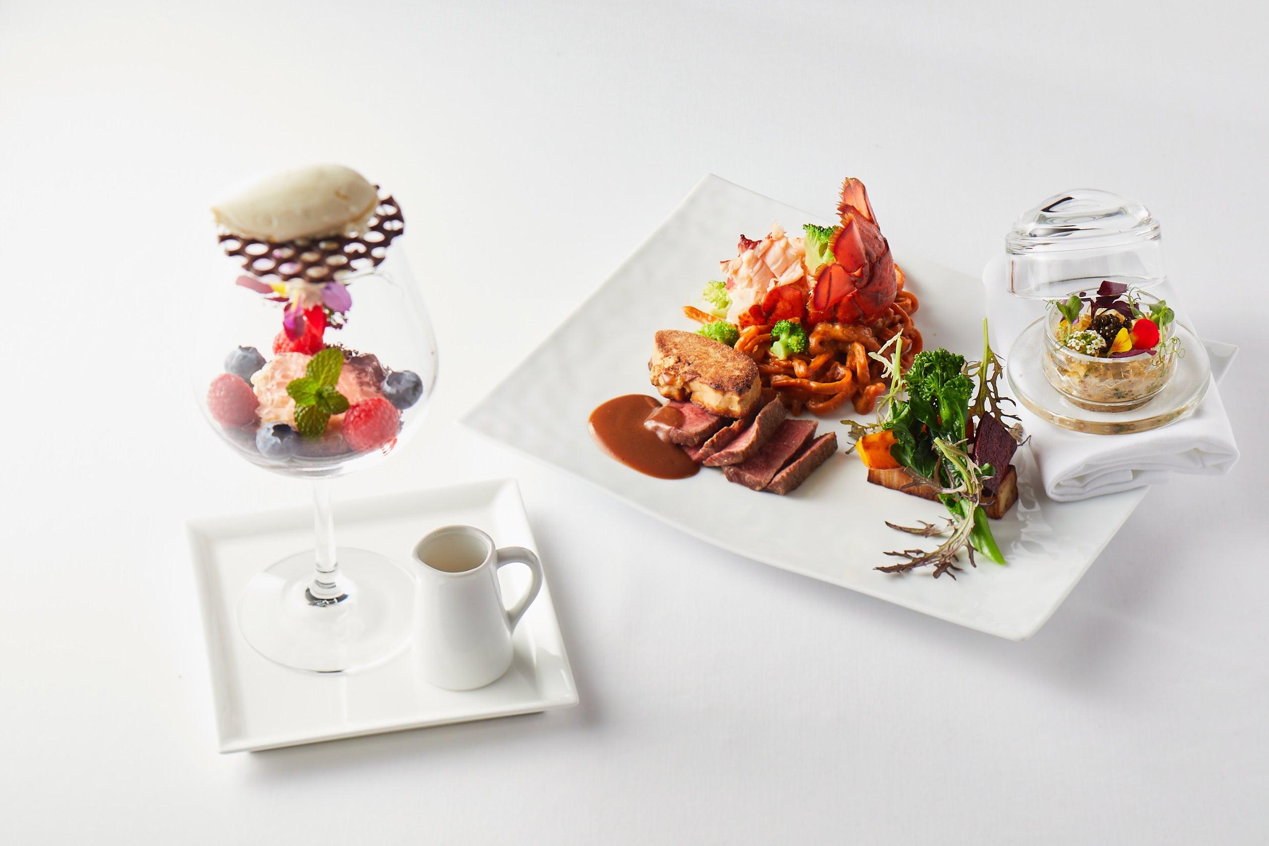 <代官山ASOチェレステ>はリストランテよりも気軽なスタイルで楽しめるもうひとつのASO。コース料理を提供している同店にとって、贅沢な料理をワンプレートにするというのは初の試み。色味やボリュームのバランス、食材のセレクトなどで、満足感をいかに高めるかを考案。メインはオマール海老をまるごと使ったアメリケーヌのタリオリーニ。その他、秋田県産黒毛和牛のタリアータとフォアグラのソテー、鮮魚のタルタルとコンソメのジュレ キャビア添えなど贅沢なワンプレート。デザートはワイングラスに盛り付けた春色のドルチェ。トップに盛り付けた糀のジェラートの上から暖かいカラメルソースを。