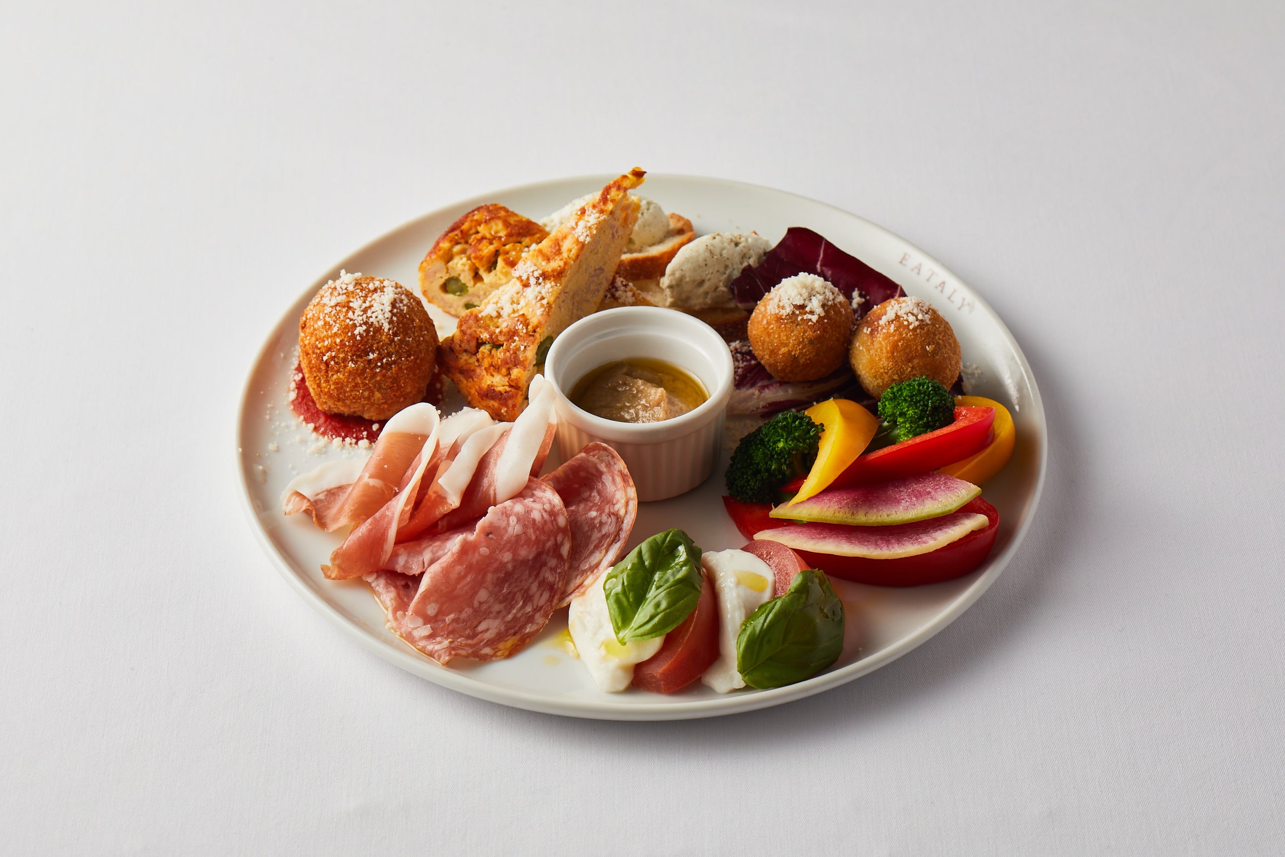 イタリアの食文化や伝統を体感できるイタリアレストラン<イータリー>。誰もが楽しめるシンプルなメニュー構成で、<イータリー>のオールスターをワンプレートに集めました。人気のトリュフのクロケッタとゴルゴンゾーラのムースをはじめ、カプレーゼ、生ハム&サラミ、アランチーニなどイタリアワインと一緒に楽しむことができる一皿です。