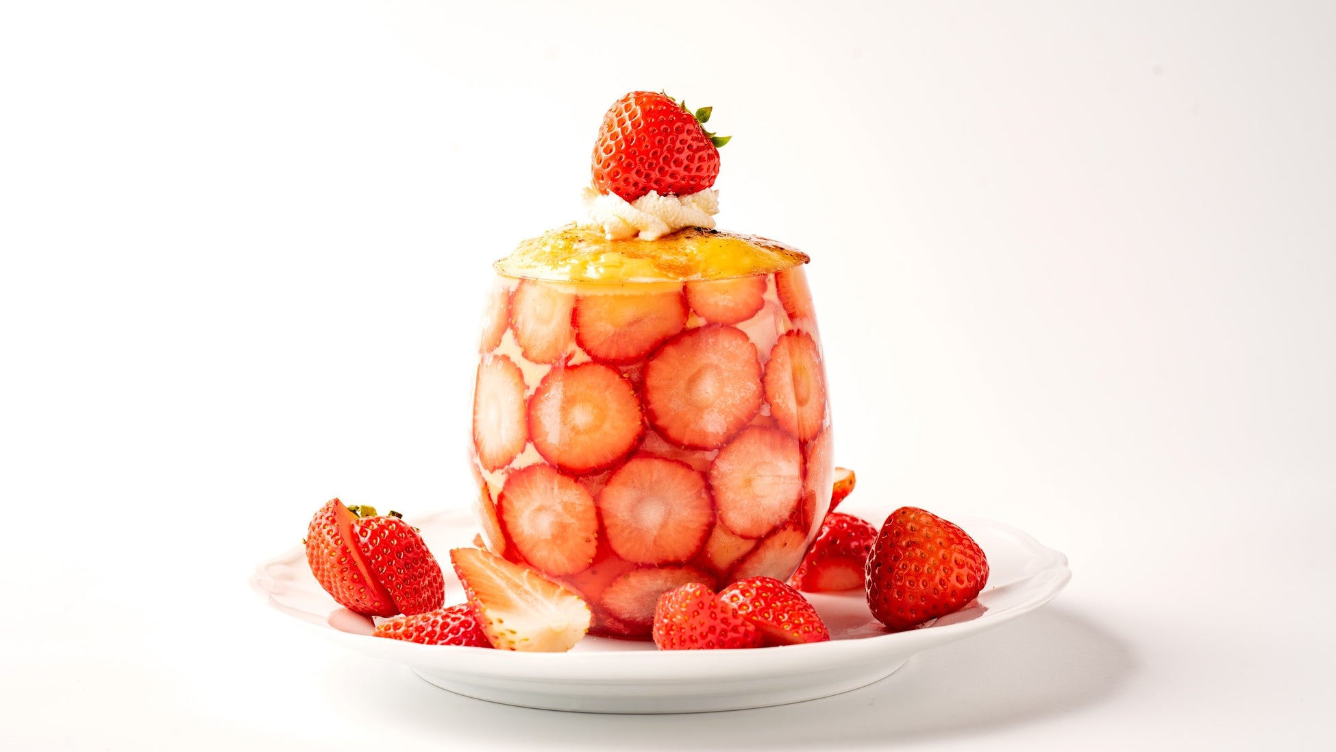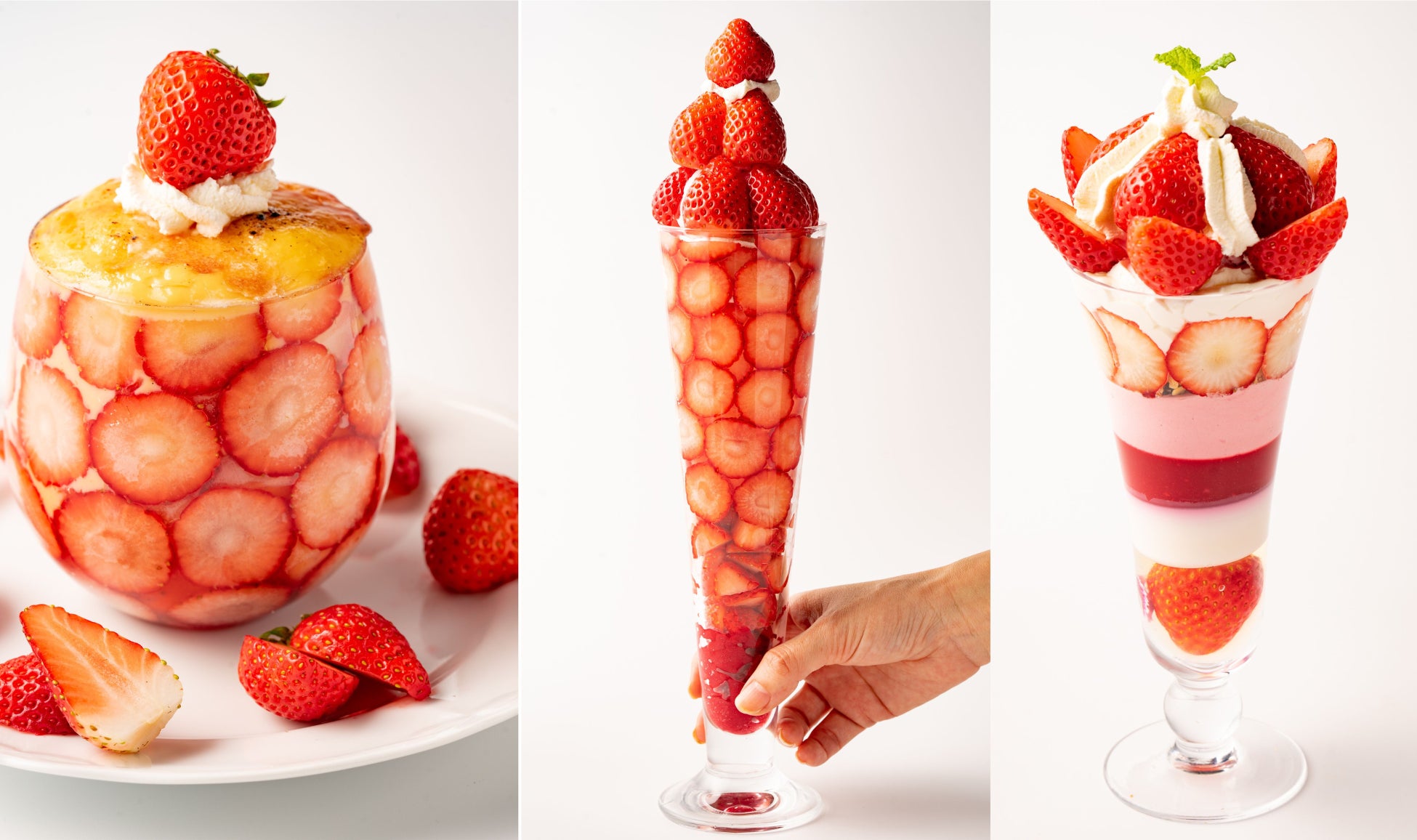 当店名物、三ツ星いちご「スカイベリー」を丸ごと1パック使⽤した⾼さ30センチの【スカイベリー苺タワーパフェ(2,780円)】や、いちごの王様「あまおう」を丸ごと1パック使⽤した【まるっとあまおう苺ブリュレパフェ(2,980円)】は、⾒ても⾷べても美味しい、⾊鮮やかな絶品パフェをご提供いたします。