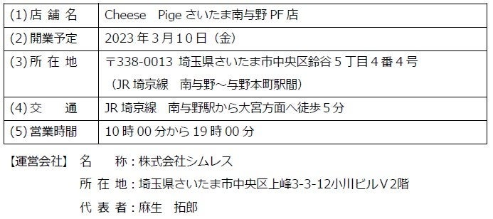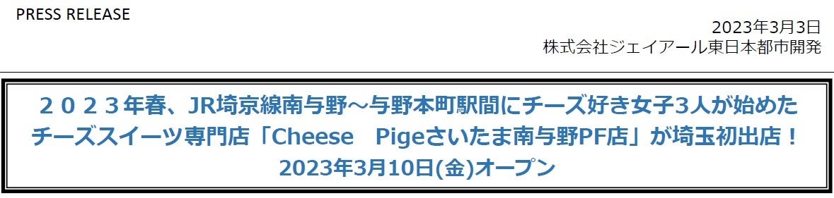 〇株式会社ジェイアール東日本都市開発は、2023年3月10日(金)、南与野~与野本町駅間に「Cheese Pigeさいたま南与野PF店」(運営会社;株式会社シムレス)を開業致します。