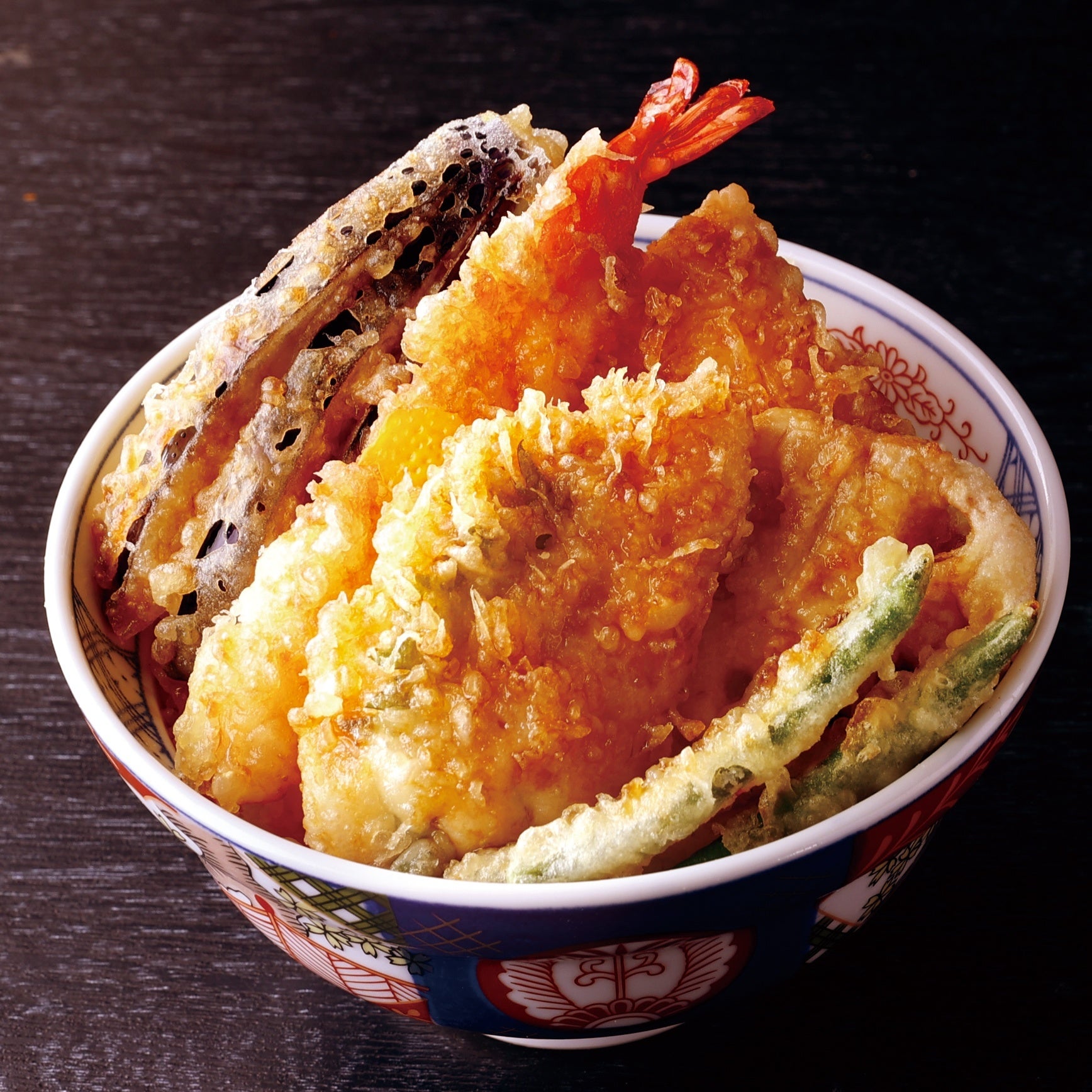 春の旬食材“桜海老”を、たまねぎと三つ葉にあわせてカラっとかき揚げにした「桜海老のかき揚げ」を盛り付けた天丼です。サクっとした食感の中で、甘さと香ばしさを感じる、春ならではのどんぶりになっています。