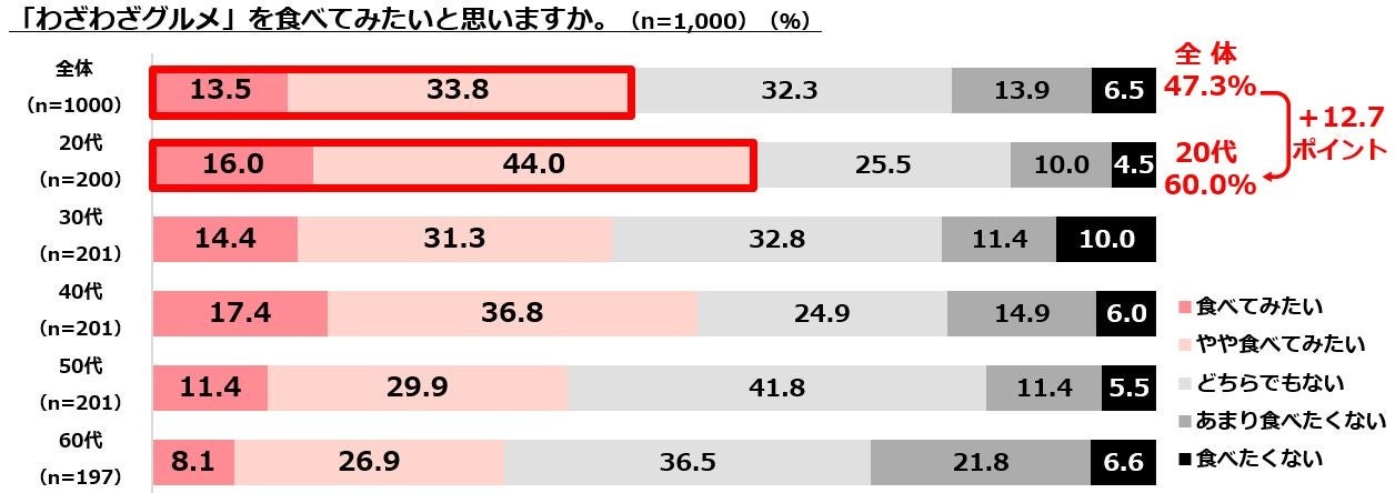 ぐるなびのユーザーを対象とした調査では、「わざわざグルメ」を食べてみたいかという質問には5割弱の人が食べてみたいと回答。特に20代は6割と高めの傾向となりました。また、理由については「同伴者と盛り上がれそう」「体験したことがない、目新しいから」が4割と最も多くなりました。
