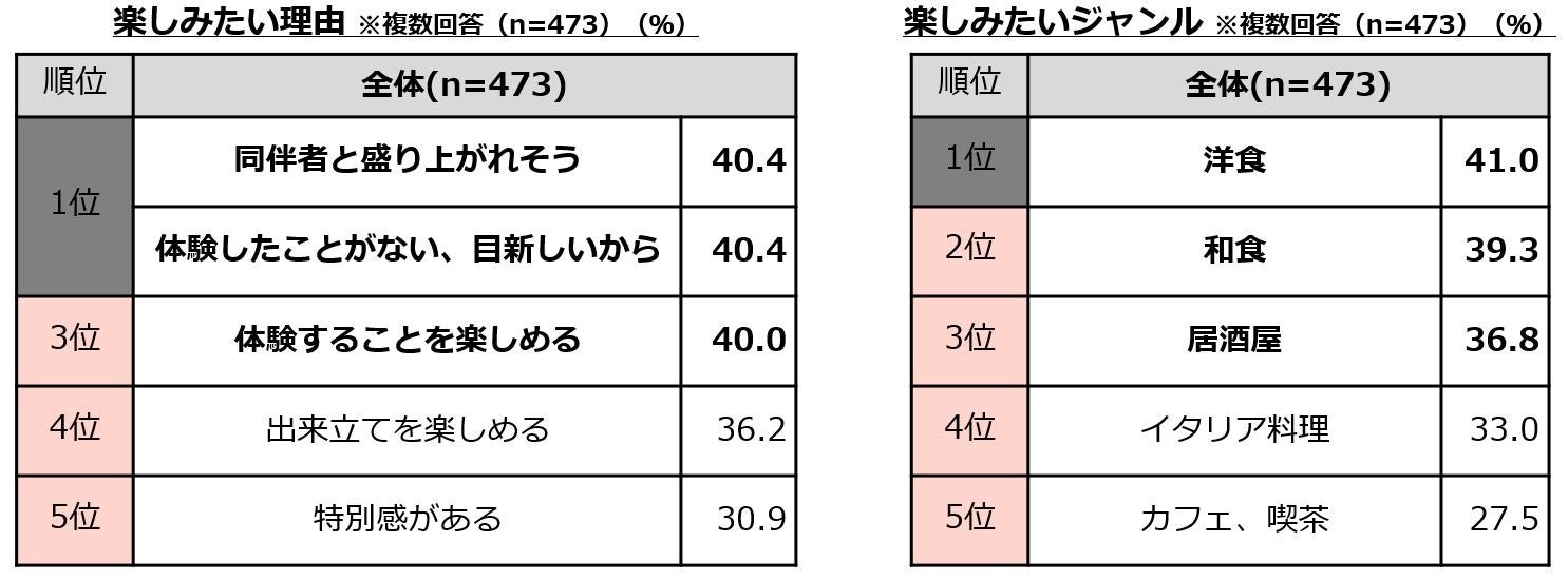 ・理由は「同伴者と盛り上がれそう」「体験したことがない、目新しいから」が4割と最も多い。