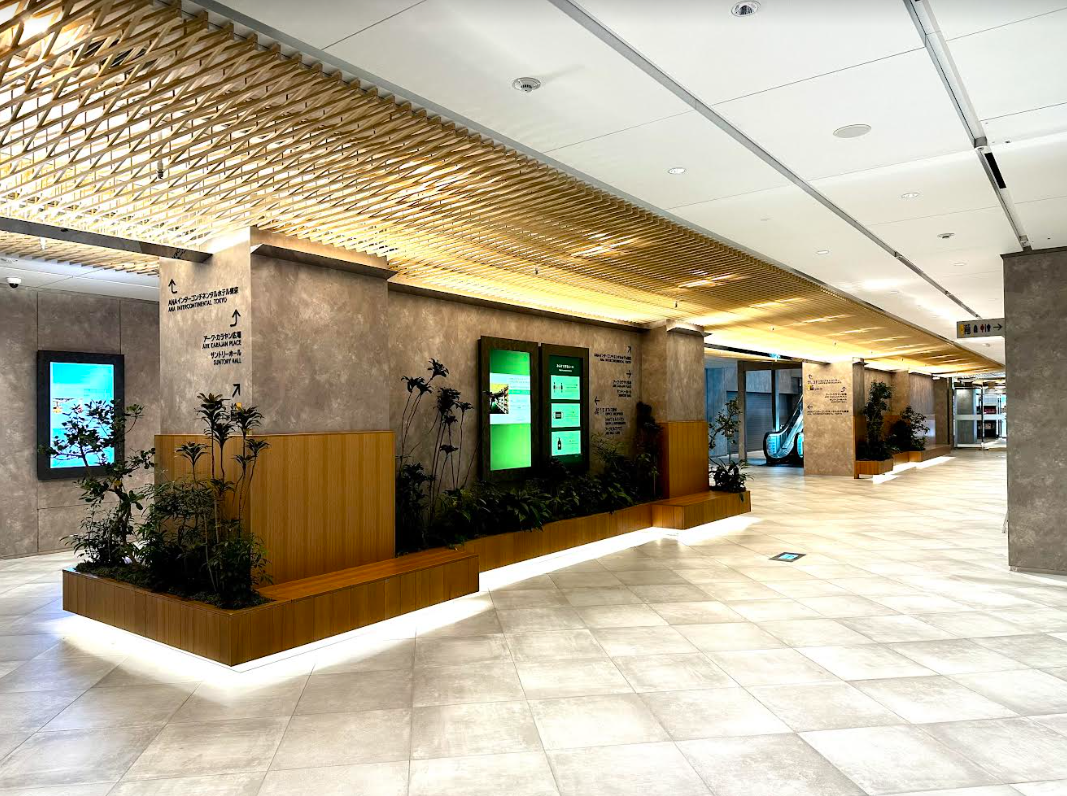 人を引き寄せ、とどまりたくなるような居心地の良い環境をつくるため、ドバイ万 博日本館を手掛けた実績を持つ建築家の永山裕子氏が空間デザインを担当。人を引き寄せることを意識してデザインされたゲートや吹き抜けのほか、居心地の良いベンチ や植栽も設置し、開放的で賑わい溢れる空間を演出します。