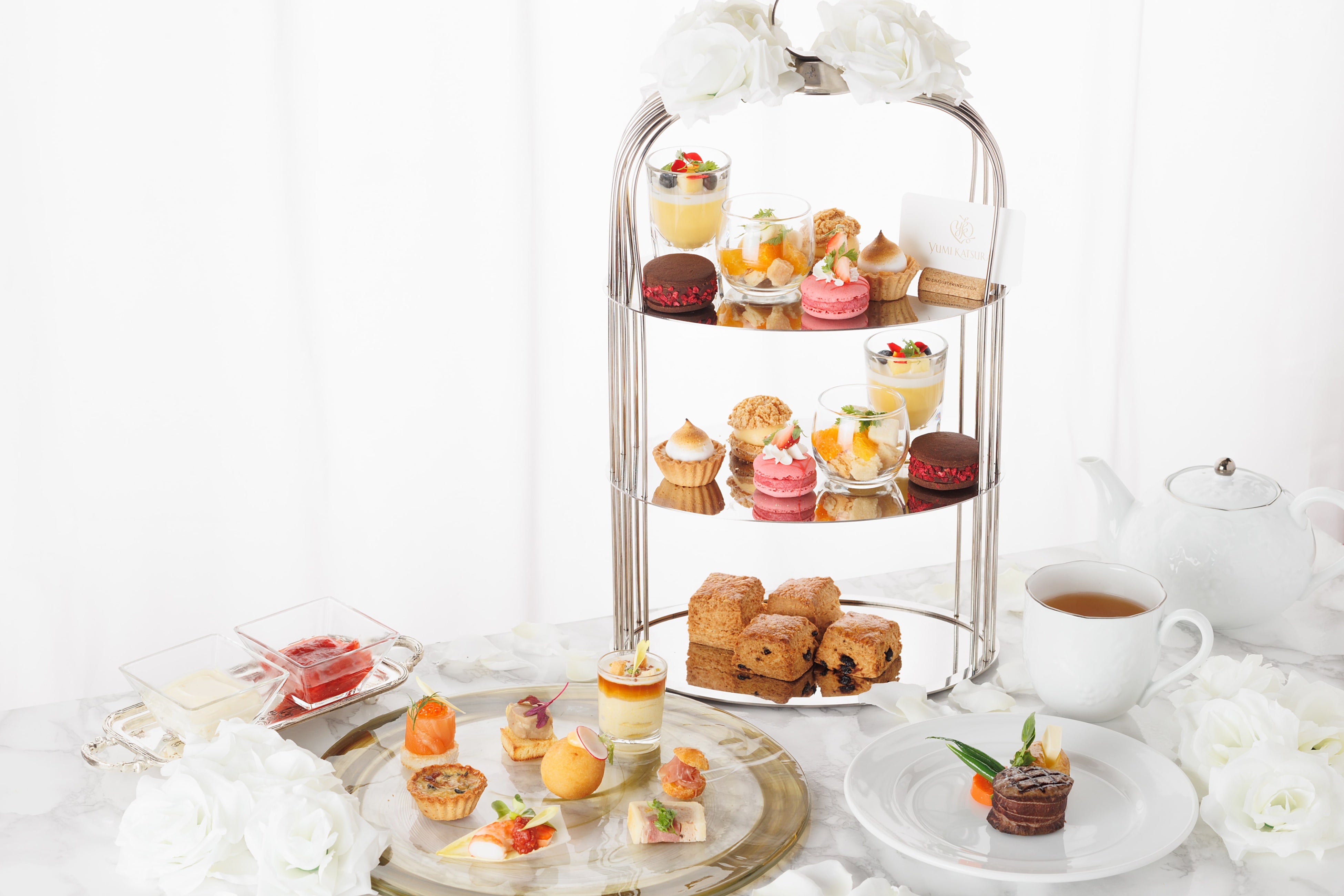 | Yumi Katsuraコラボアフタヌーンティー 【開催期間】 4月9日(日)~6月25日(日)のランチ開催日 ※ランチは毎週日曜日のみ開催(貸切等により開催がない日もございます) 【予約可能時間】 【料理内容】 ~Scones~2種 ~Mini Size Steak~ ~Sweets~6種 ~Dessert~ ~Coffee and Tea~ 【価格】 【注意事項】 |