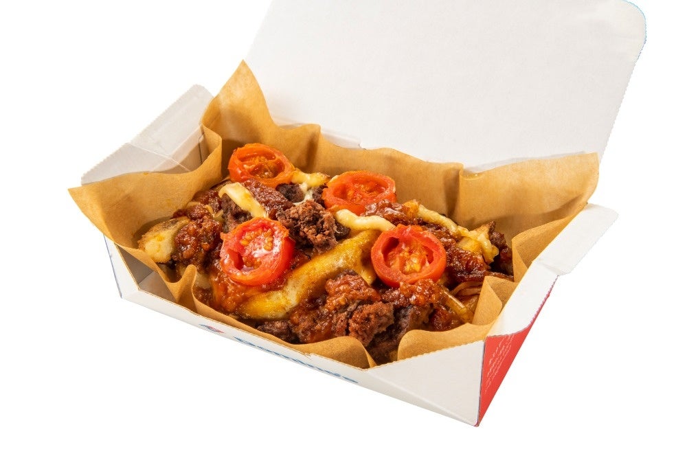 デリバリーをご利用されるお客さまにも、出来立てと変わらない食感のポテトフライを味わっていただくために、デリバリーに適したポテトフライを使用し、ジューシーな100%ビーフパティをポテトフライへ豪快にトッピング!パティの旨みが染み込んだ、日本人好みのミートソースに程よい酸味のチェリートマトをのせ、マヨソースで仕上げました。旨みたっぷりのミートソースに絡めて食べるポテトは、贅沢で至福のひとときを演出します。