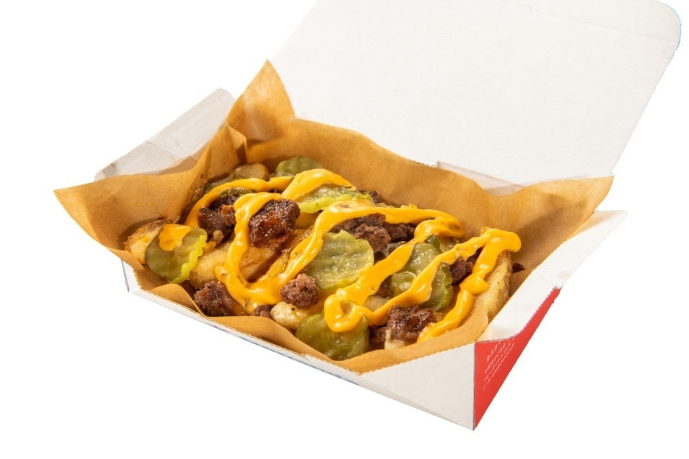 デリバリーをご利用されるお客さまにも、出来立てと変わらない食感のポテトフライを味わっていただくために、デリバリーに適したポテトフライを使用しジューシーな100%ビーフパティをポテトフライへ豪快にトッピングし、特製バーガーソースと風味豊かなチェダーチーズをあわせました。酸味のきいたピクルスと濃厚チーズポテトの味わいは、食べる手がとまらない逸品です。