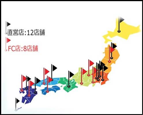 ・FC店:8ヶ所(大河原店, 熊本店, 高知店, 松本イオン, 広島段原イオン, 筑紫野店, 愛媛松山,静岡店)