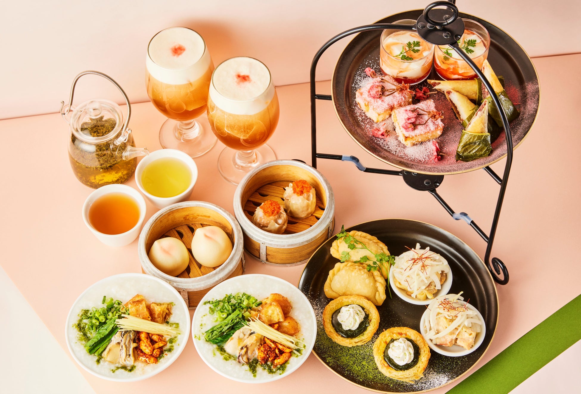 今春は当店人気のチャイニーズスイーツに“桜・抹茶・梅”などの和のスパイスを効かせ、心華やぐ日本の春を取り入れました。さらに、爽やかな金木犀の香りが特徴的な“桂花烏龍茶”と“自家製の桜シロップ”を合わせた新定番チャイニーズフォームティー「桜花泡茶(インファフォームティー)」で、春らしい華やかなひとときを演出致します。また自慢の点心に加え、最後に花を添える「牡蠣とあおさのお粥」はあたたかい状態にてお召し上がり頂けるようお客様のタイミングを見ながら出来立てをお届け。