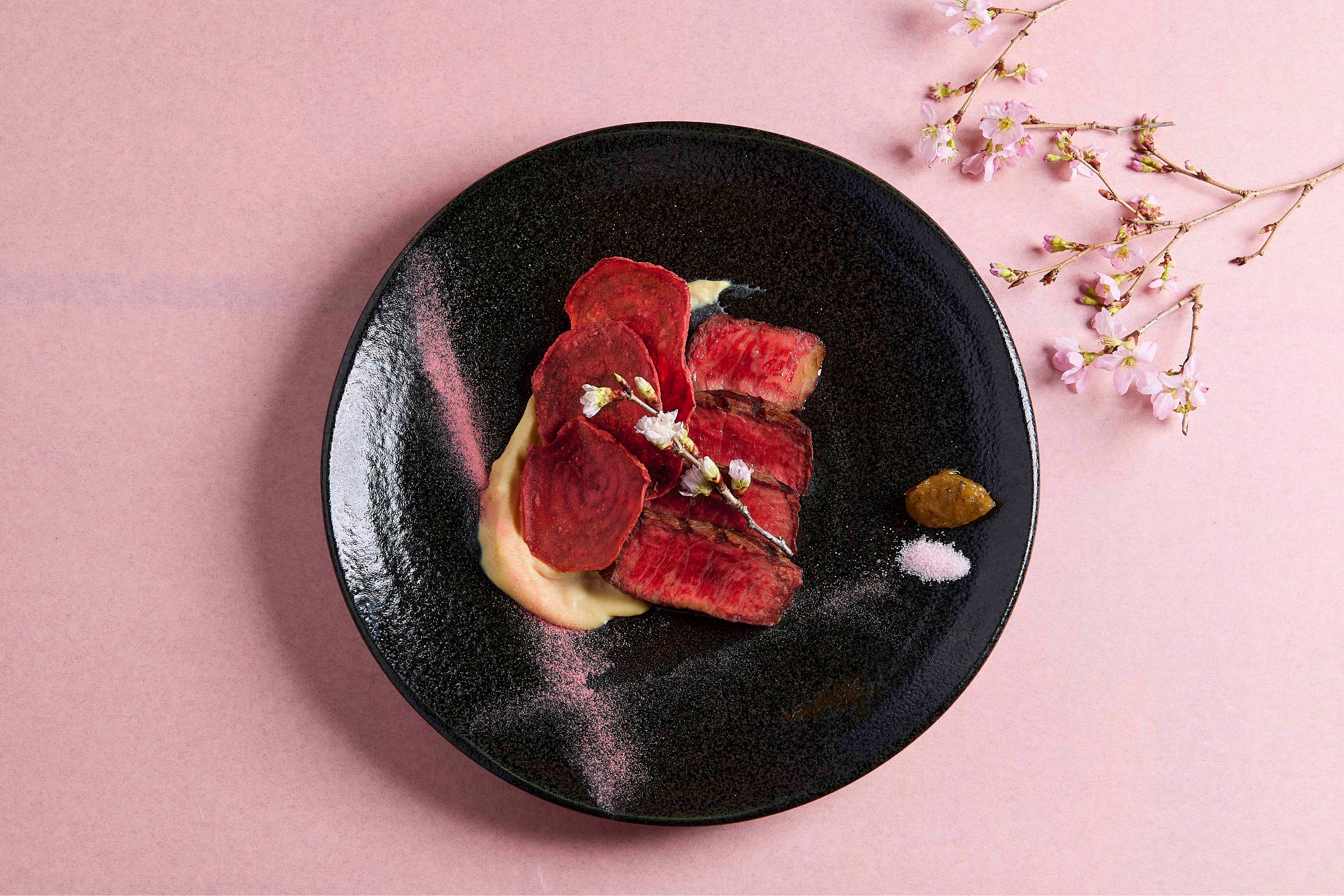 「兵庫県産志方牛 赤身肉のタリアータ 桜塩とリュバーブのジャムを添えて~Shikata Beef Steak Seasonal Style~」……3,080円