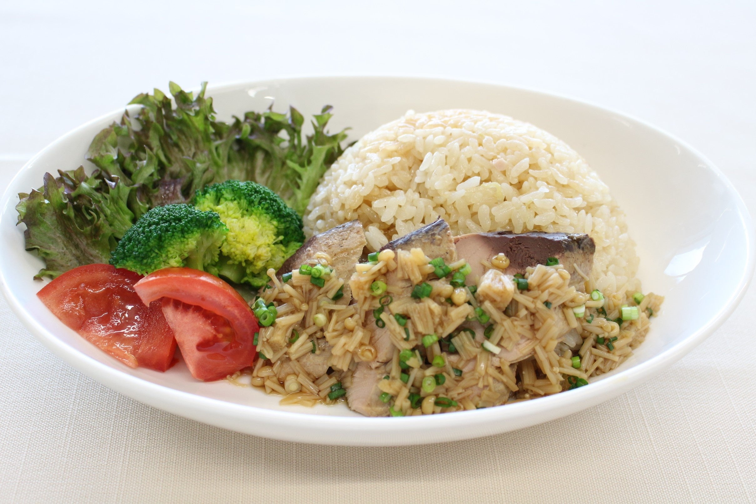 特に若い女性から人気を集めているエスニック料理の中で、自給率が高い米を使った料理「カオマンガイ」を“にっぽん食”に。鶏肉の代わりに、比較的高い自給率を誇るかつおを使ったほか、昆布やきのこのうま味を利用して、おいしく仕上げています。