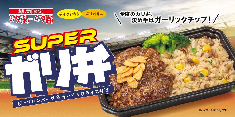 ブラックペッパー香るガーリックライスと、じゅわ~とやわらかい100%ビーフハンバーグの相性がたまらない「ガリ弁」はこのボリューム感で1,000円(*1)のお得な価格です。食べ応え抜群のボリューム感とお手頃な価格から再販希望の声が多かった「ガリ弁」を、お花見やスポーツ観戦などでテイクアウト・デリバリー需要の高まる春休み・行楽シーズン限定で復活させました。