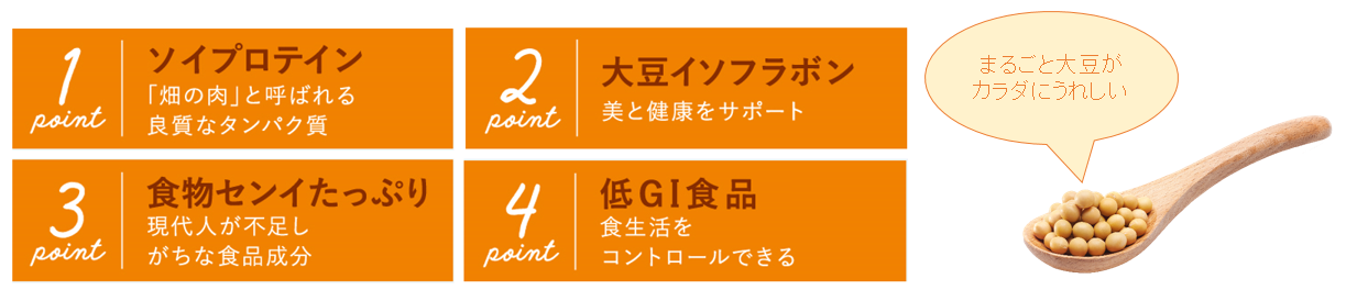 ・まるごと大豆使用で、食物繊維たっぷり&低GI食品、グルテンフリー