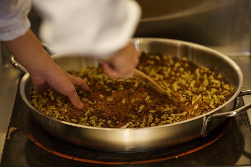( 1 )伊良コーラの自社工房でスパイスの調合など、シロップのコアパートを製造する