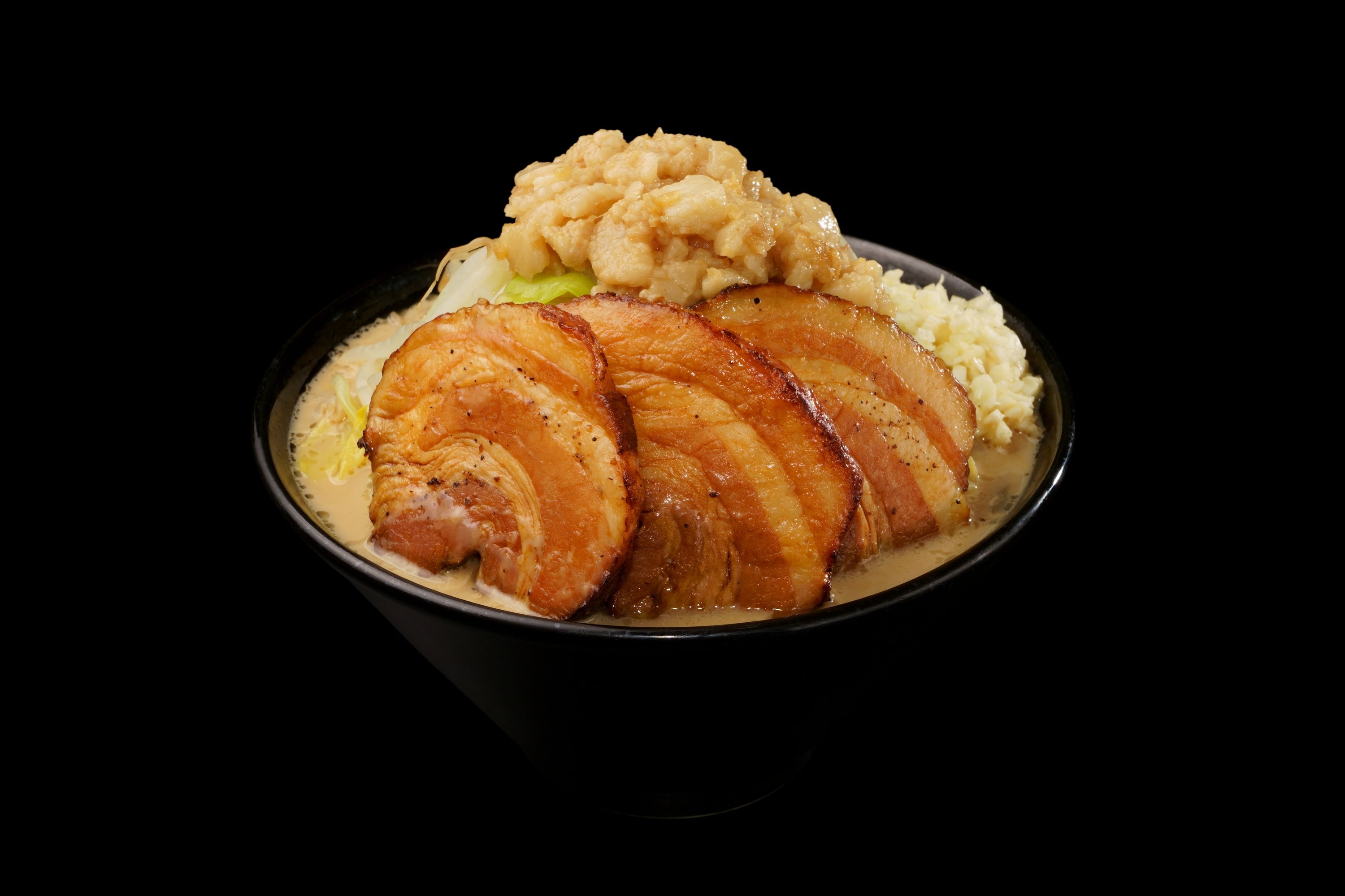 豚骨ベースの濃厚スープは、ラードや背脂の甘みが溶け出したまろやかな口当たりで、レギュラーメニューの鶏白湯スープとは一線を画す味わい。豚の旨みたっぷりのスープを全粒粉が練り込まれた風味豊かな中太平打ち麺にまとわせて口に運べば、その満足感に思わず唸ってしまうこと間違いなし。さらに特筆すべきは、丼の中でも存在感抜群のチャーシュー!ラーメンに乗せた瞬間に感じる香ばしさもさることながら、しっかりと染みたタレの旨みと極上のホロホロ食感に驚愕することだろう。背脂とニンニクを忘れずにトッピングすれば、大満足間違いなし!