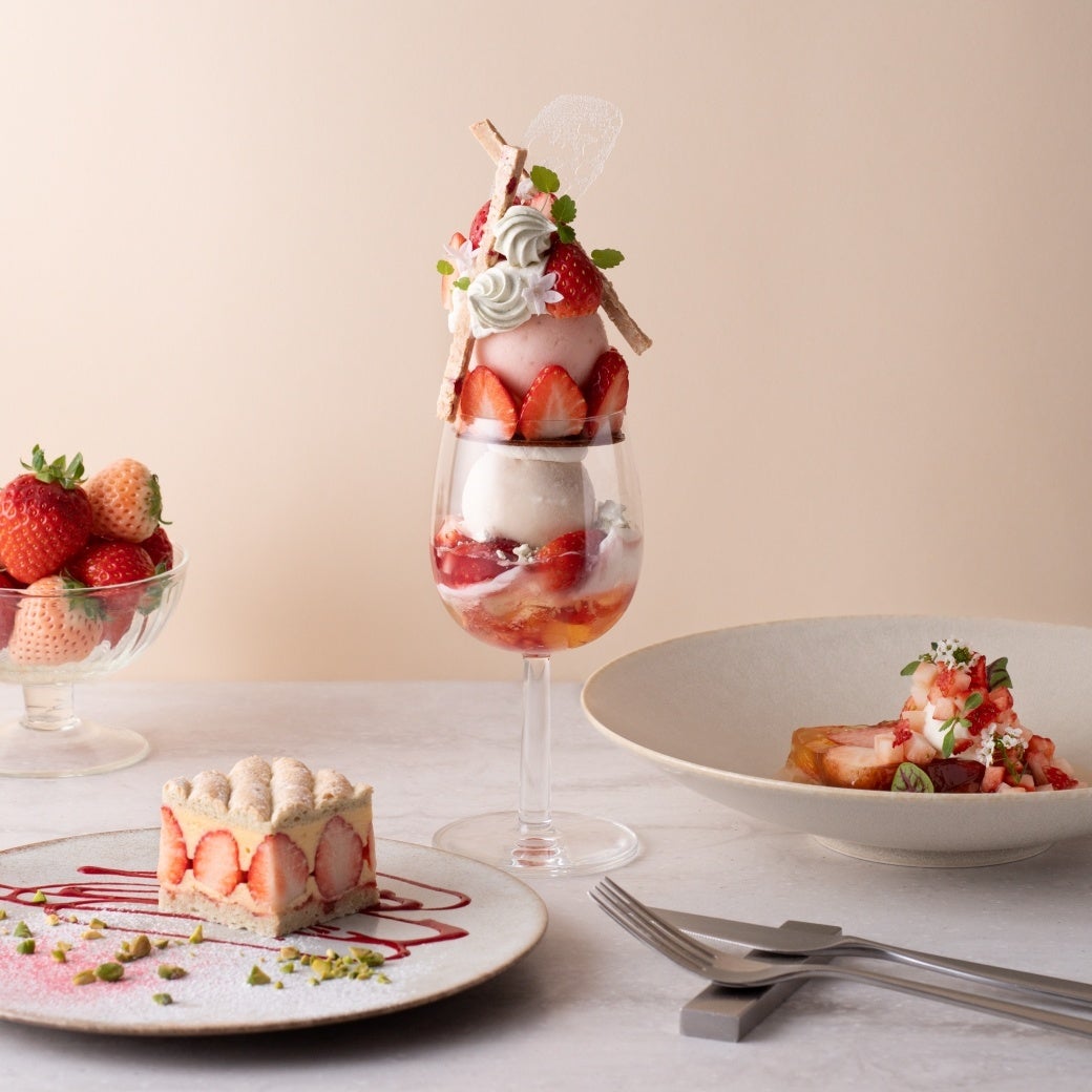 春の暖かい日差しを浴びて育った完熟いちごを、たっぷりお楽しみいただけるコースをご用意しました。甘い香りやほのかな酸味、ハーブやお花の香りが春を満喫させてくれます。いちごのみずみずしさを演出したプレートから始まり、コクと甘さを楽しめるプレート、最後はいちごに2種類のお花を合わせた華やかで上品なパフェへとつながっていきます。ぜひ、ご賞味ください。