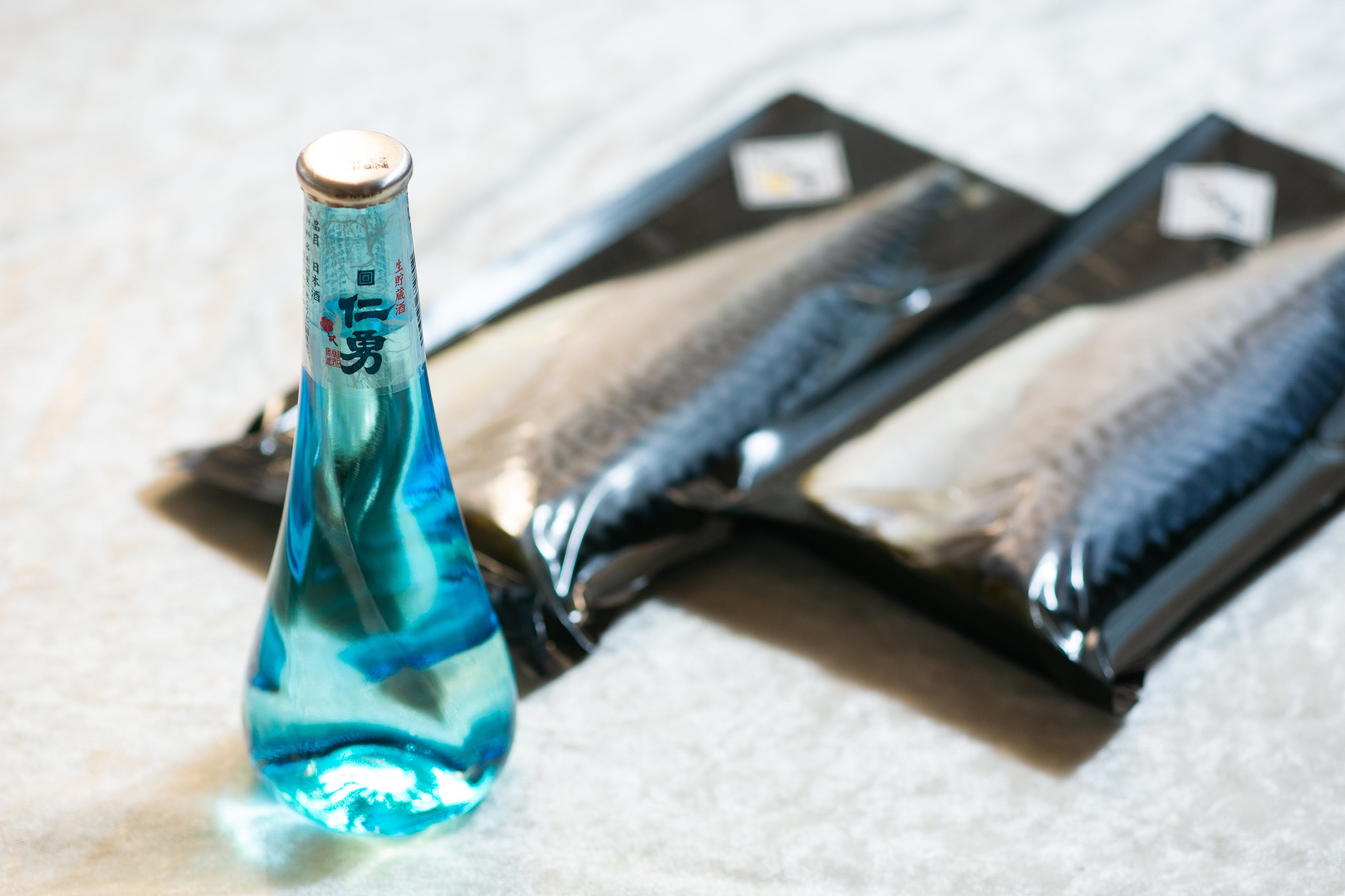 2023年3月8日から31日までに『くちどけ鯖』をご購入いただいたお客様には日本酒『仁勇』(180ml)オーロラボトル1本をプレゼントいたします。ブルーボトルの『仁勇』は、パーティーや披露宴会場などでも多く利用されています。