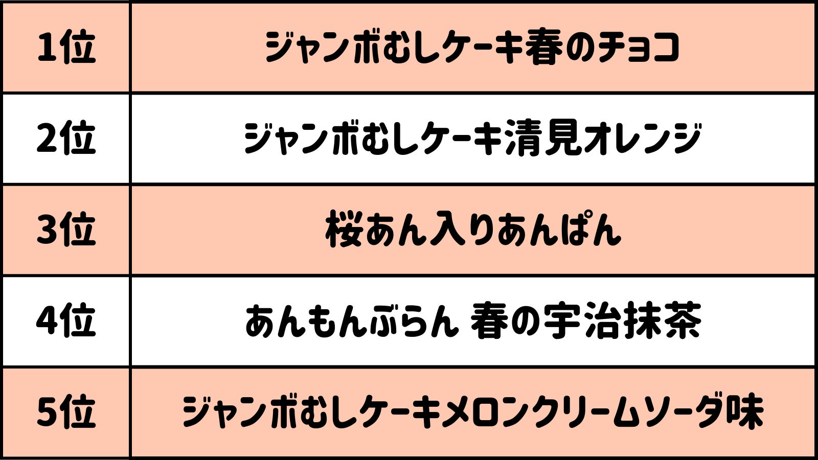 1~2位は、人気の”ジャンボむしケーキ”がランクイン。1位の「春のチョコ」は“北海道生乳”を使用。春らしいまろやかな味わいです。2位の「清見オレンジ」は“国産清見オレンジ”を使用した爽やかな香りが特徴。3位の「桜あん入りあんぱん」は道明寺粉入り桜あんとこしあんで桜餅のような味わいに仕立てました。