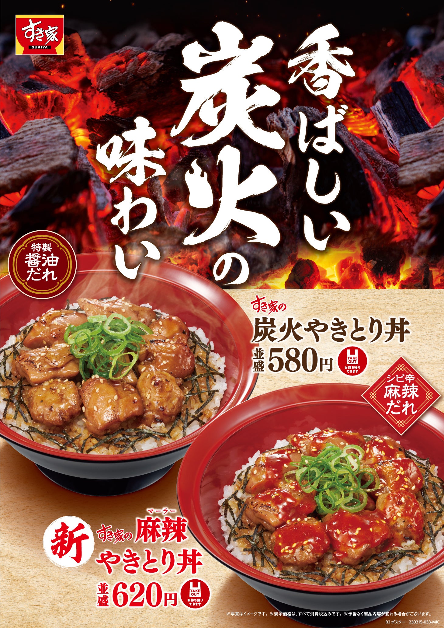 株式会社すき家(代表取締役社長:笹川 直樹 本社:東京都港区)が展開する牛丼チェーン店「すき家」は、3月15日(水)AM9:00より「炭火やきとり丼」を販売します。