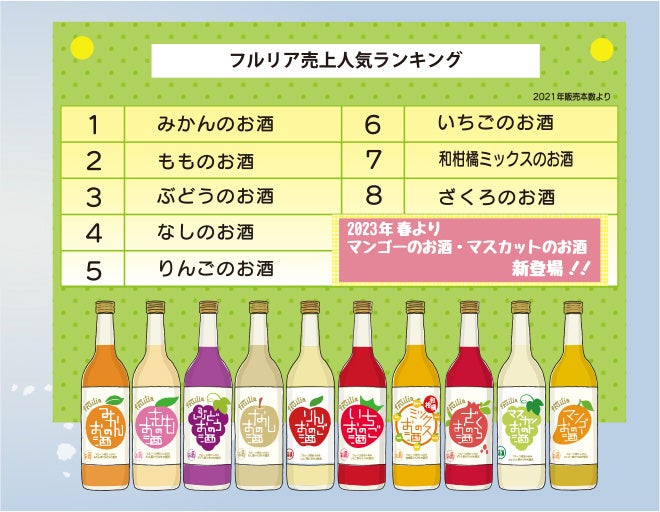 フルリアみかんのお酒が1番人気。他にも桃やぶどう、なし、りんごなど馴染みのあるフルーツが人気となっております。今春よりマンゴーとマスカットが加わるので更に種類が増え、お気に入りのフルーツをその日の気分によって楽しめます。ぜひ自分好みのフレーバーを見つけてみてください。