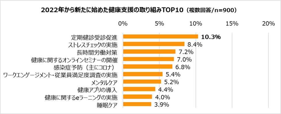 ・2022年から新たに始めた健康支援の取り組みは「定期健診受診促進」(10.3%)、「ストレスチェックの実施」(8.4%)、「長時間労働対策」(7.2%)の順であり、どれも1割程度にとどまった。