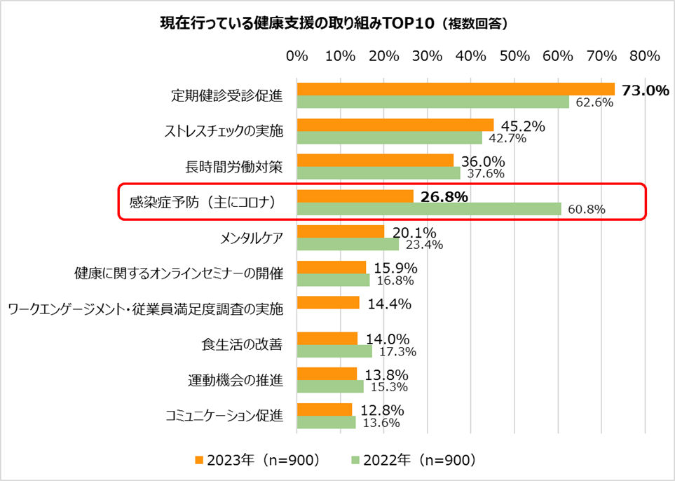 ・健康支援の取り組みは、前年と比較すると減少した項目が目立った。中でも「感染症予防(主にコロナ)」は2022年が60.8%であったのに対し、2023年は26.8%と大きく減少した。一方で、「定期健診受診促進」が73.0%と最も多く、前年よりより10.4ポイント上昇した。