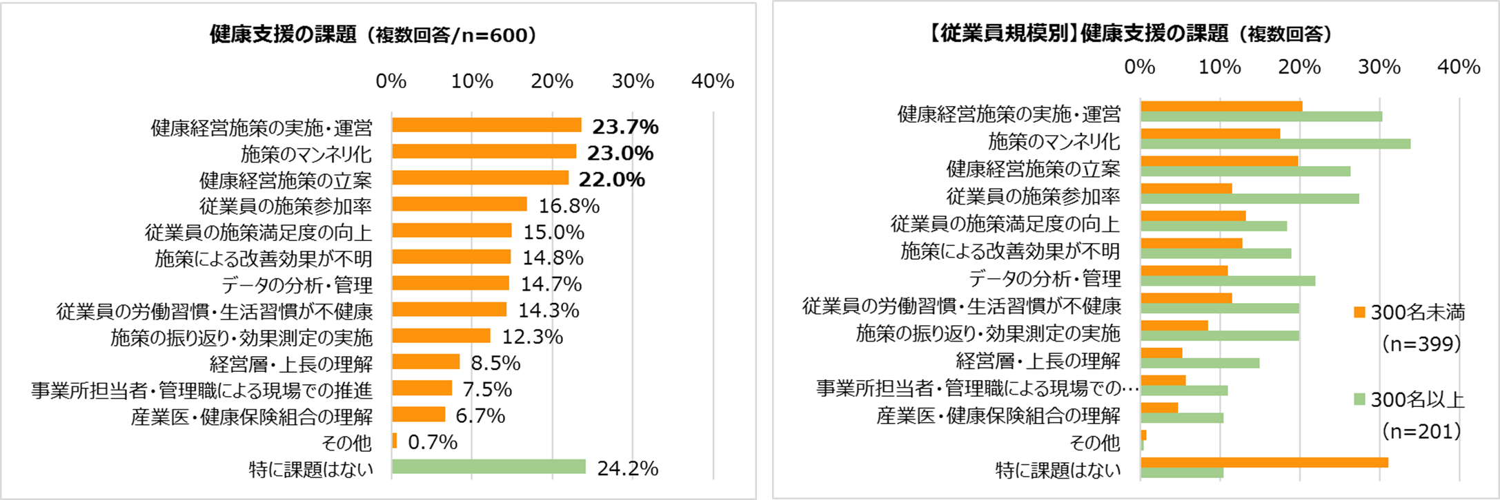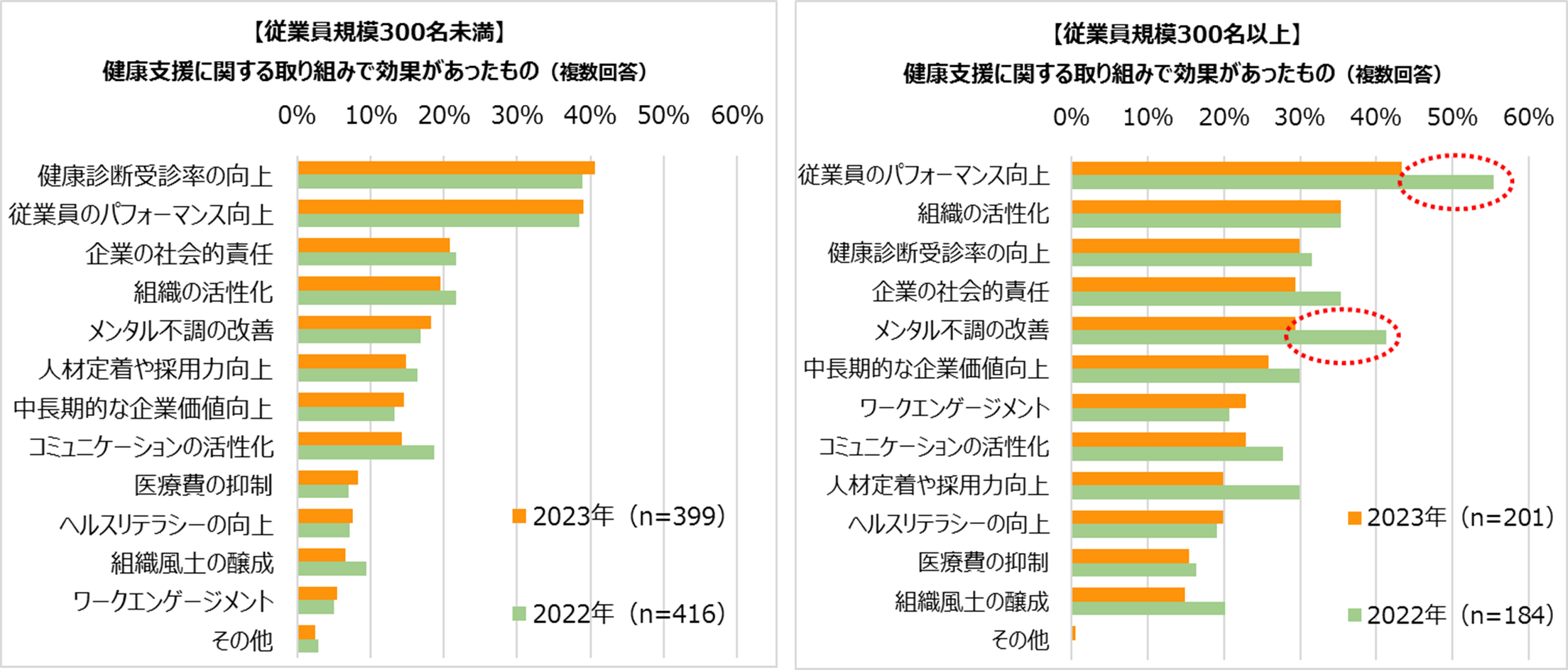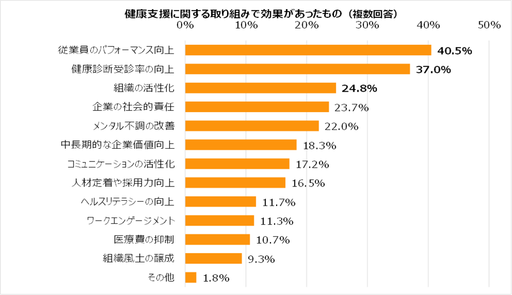 ・健康支援の取り組みで効果があったものは「従業員のパフォーマンス向上」40.5%、「健康診断受診率の向上」37.0%、「組織の活性化」(24.8%)の順で高かったものの、昨年と比較して全体的にスコアが下がった項目が多かった。特に、従業員規模が300名以上の企業においては、スコアの減少が顕著に現れた。