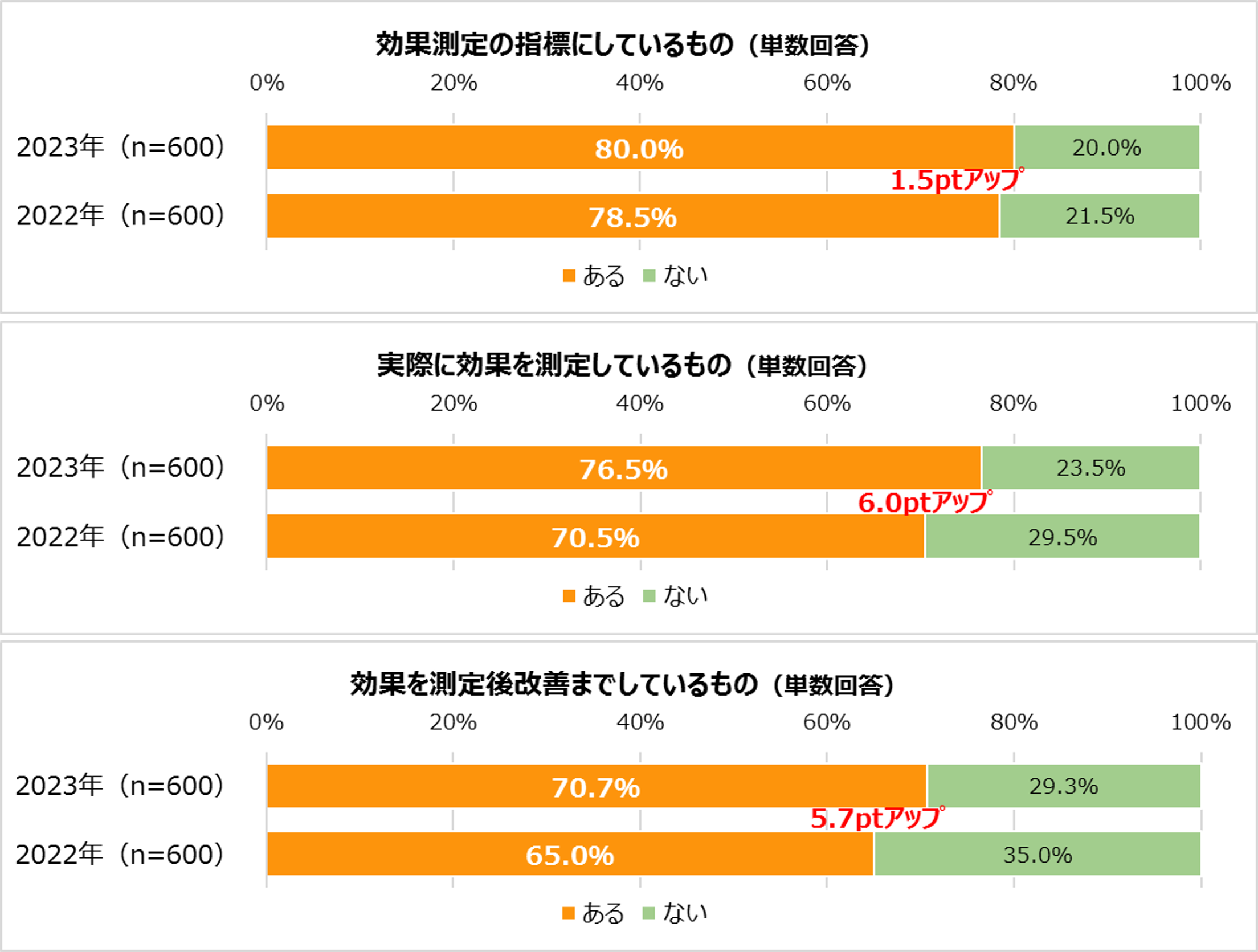 ・健康経営に携わる経営層(役員以上)と部門担当者によると、「指標にしているものがある」と回答したのは80.0%、「効果を測定しているものがある」と回答したのは76.5%、「効果を測定後改善までしているものがある」と回答したのは70.7%となり、「効果測定の指標化」及び「効果測定の改善」スコアが前年を超えた。2022年より健康経営優良法人認定において、「大規模法人部門」では「健康経営の推進に関する効果検証」が、「中小規模法人部門」では「評価・改善」が認定要件に必須化されたことから、単に実施するだけでなく、その効果を検証し、成果を踏まえた実施フェーズへ移行したことが推察される。