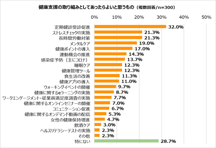 ・あったらよいと思うものは「定期健診受診促進」(32.0%)、「ストレスチェックの実施」(21.3%)、「長時間労働対策」(21.3%)、「メンタルケア」(19.0%)の順で高くなった。