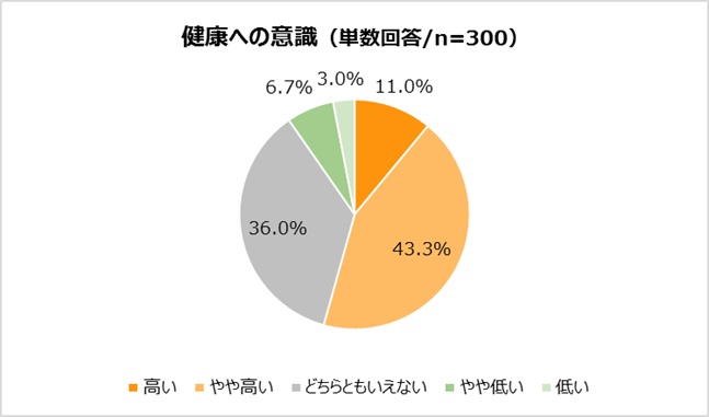 ・従業員の健康意識は高い(やや高いを含む)と回答した割合が約半数程度、健康支援の利用率・満足度は項目別では4割程度の回答も見られることから、個人の健康意識の向上及び現在取り組んでいる施策においては、今後改善の余地がある。