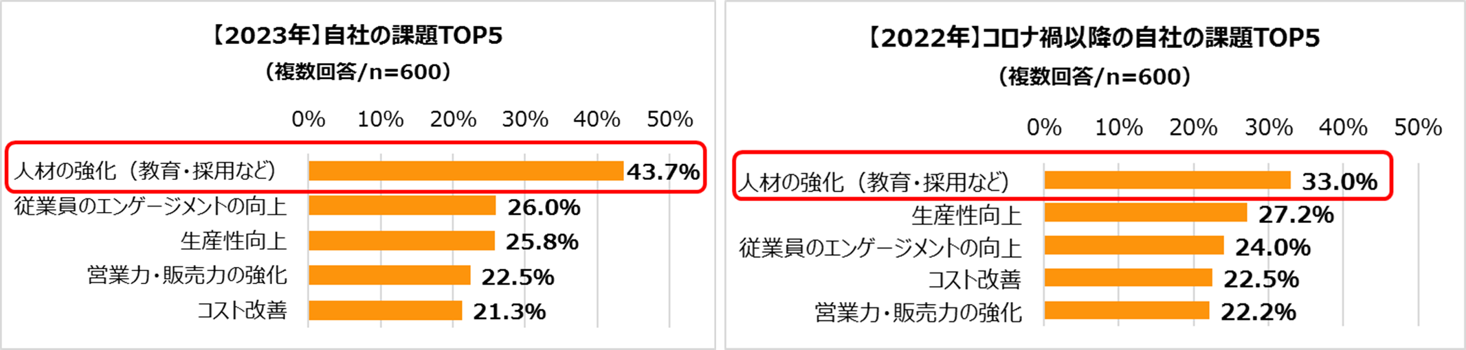 ・企業の課題は「人材の強化」がトップで、昨年調査と比較し “人材”へ投資する健康経営が拡大している。
